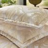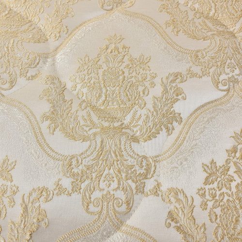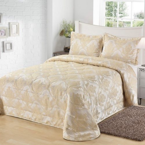 Стеганое, жаккардовое покрывало на подкладке из плотной декоративной ткани. Отличительной особенностью данной модели является её оригинальный жаккардовый рисунок. Данное стеганое покрывало представляет собой многослойное изделие, внешняя часть изделия состоит из жаккардового полотна, а внутренний наполнитель состоит из силиконизированного волокна плотность которго составляет 100г/м2. Для того, чтобы внутренний слой не сбивался в комки и создать фактурность внешних слоев, по всей площади покрывала производится простежка (прошивание). Это могут быть ровные линии или фантазийные узоры.