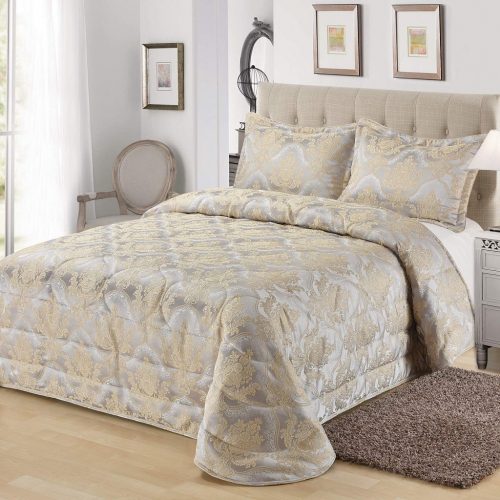 Стеганое, жаккардовое покрывало на подкладке из плотной декоративной ткани. Отличительной особенностью данной модели является её оригинальный жаккардовый рисунок. Данное стеганое покрывало представляет собой многослойное изделие, внешняя часть изделия состоит из жаккардового полотна, а внутренний наполнитель состоит из силиконизированного волокна плотность которго составляет 100г/м2. Для того, чтобы внутренний слой не сбивался в комки и создать фактурность внешних слоев, по всей площади покрывала производится простежка (прошивание). Это могут быть ровные линии или фантазийные узоры.