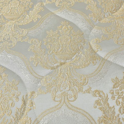 Стеганое, жаккардовое покрывало на подкладке из плотной декоративной ткани. Отличительной особенностью данной модели является её оригинальный жаккардовый рисунок. Данное стеганое покрывало представляет собой многослойное изделие, внешняя часть изделия состоит из жаккардового полотна, а внутренний наполнитель состоит из силиконизированного волокна плотность которго составляет 100г/м2. Для того, чтобы внутренний слой не сбивался в комки и создать фактурность внешних слоев, по всей площади покрывала производится простежка (прошивание). Это могут быть ровные линии или фантазийные узоры.
