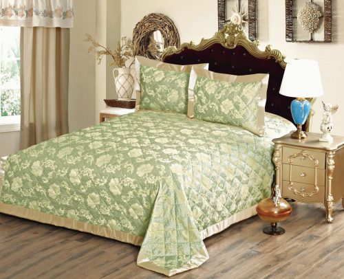 Стеганое, жаккардовое покрывало на подкладке из плотной декоративной ткани. Отличительной особенностью данной модели является её оригинальный жаккардовый рисунок. Данное стеганое покрывало представляет собой многослойное изделие, внешняя часть изделия состоит из жаккардового полотна, а внутренний наполнитель состоит из силиконизированного волокна плотность которго составляет 100г/м2. Для того, чтобы внутренний слой не сбивался в комки и создать фактурность внешних слоев, по всей площади покрывала производится простежка (прошивание). Это могут быть ровные линии или фантазийные узоры.