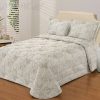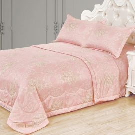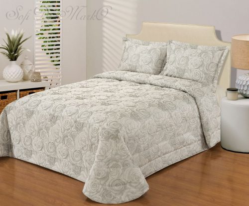 Стеганое, жаккардовое покрывало на подкладке из плотной декоративной ткани. Отличительной особенностью данной модели является её оригинальный жаккардовый рисунок. Данное стеганое покрывало представляет собой многослойное изделие, внешняя часть изделия состоит из жаккардового полотна, а внутренний наполнитель состоит из силиконизированного волокна плотность которго составляет 100г/м2. Для того, чтобы внутренний слой не сбивался в комки и создать фактурность внешних слоев, по всей площади покрывала производится простежка (прошивание). Это могут быть ровные линии или фантазийные узоры.