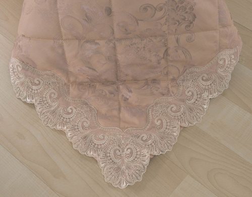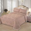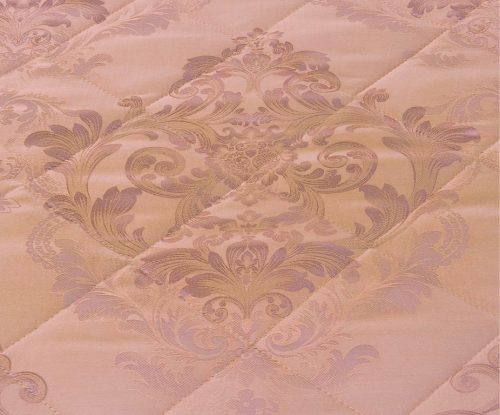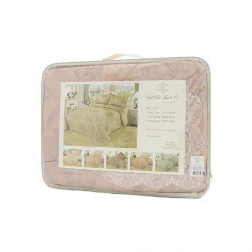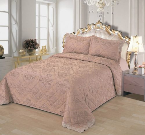 Стеганое, жаккардовое покрывало на подкладке из плотной декоративной ткани. Отличительной особенностью данной модели является её оригинальный жаккардовый рисунок. Данное стеганое покрывало представляет собой многослойное изделие, внешняя часть изделия состоит из жаккардового полотна, а внутренний наполнитель состоит из силиконизированного волокна плотность которго составляет 100г/м2. Для того, чтобы внутренний слой не сбивался в комки и создать фактурность внешних слоев, по всей площади покрывала производится простежка (прошивание). Это могут быть ровные линии или фантазийные узоры.