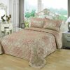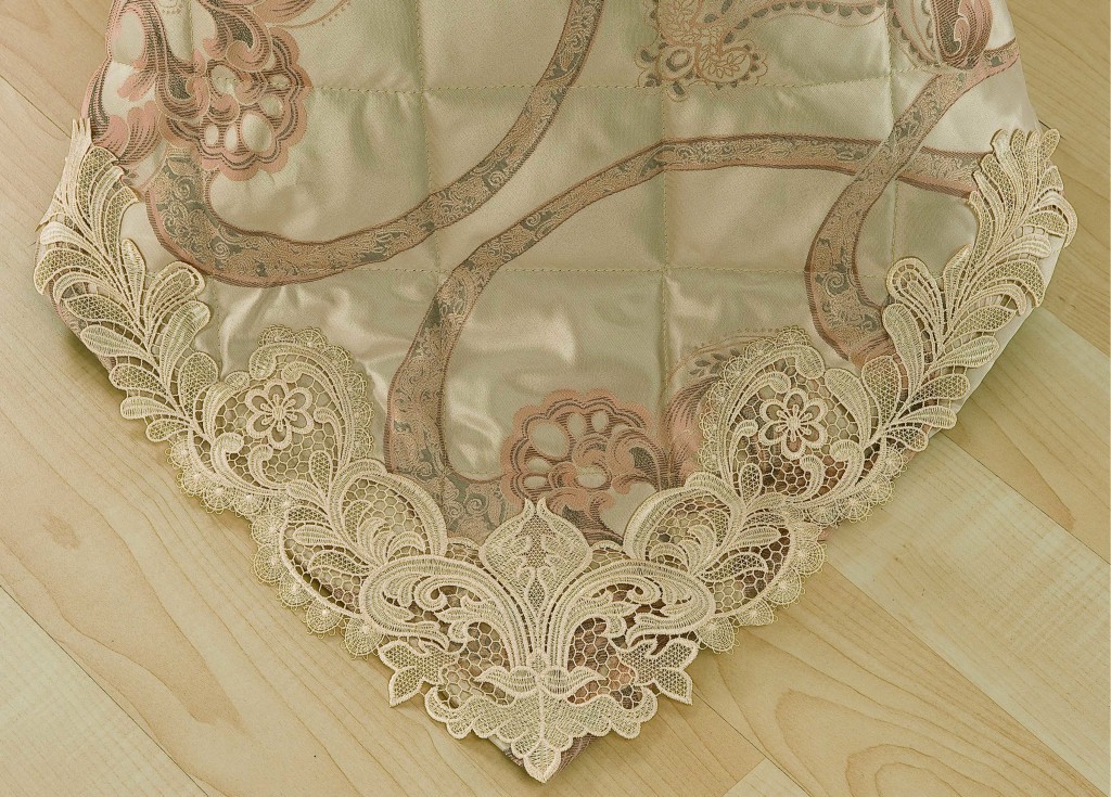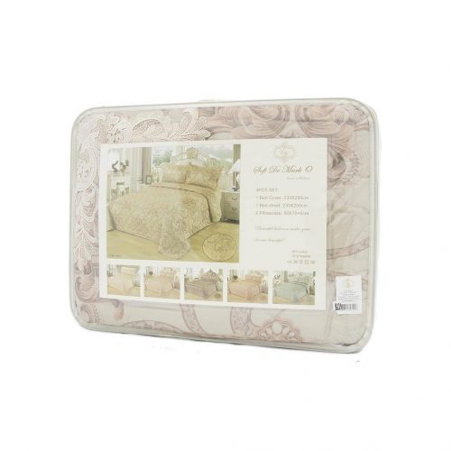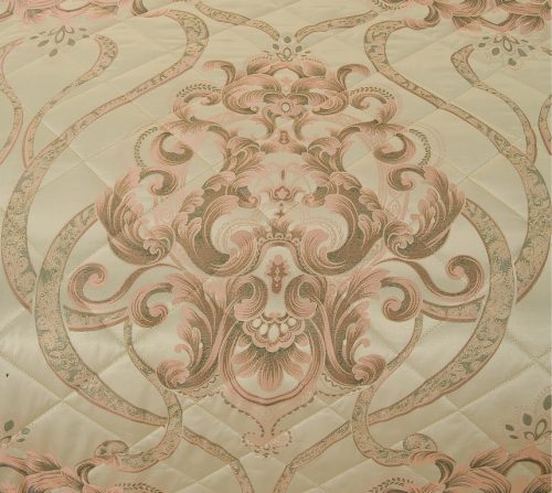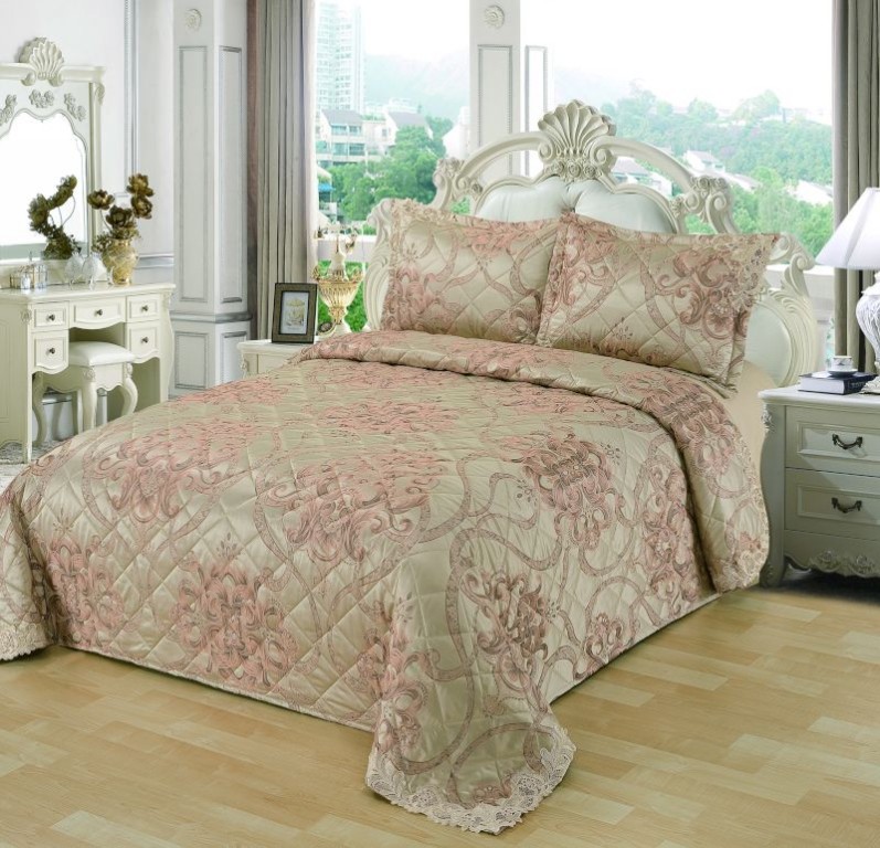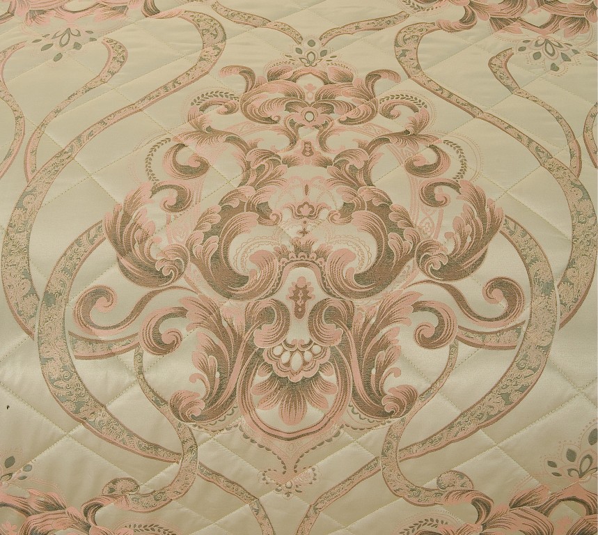 Стеганое, жаккардовое покрывало на подкладке из плотной декоративной ткани. Отличительной особенностью данной модели является её оригинальный жаккардовый рисунок. Данное стеганое покрывало представляет собой многослойное изделие, внешняя часть изделия состоит из жаккардового полотна, а внутренний наполнитель состоит из силиконизированного волокна плотность которго составляет 100г/м2. Для того, чтобы внутренний слой не сбивался в комки и создать фактурность внешних слоев, по всей площади покрывала производится простежка (прошивание). Это могут быть ровные линии или фантазийные узоры.