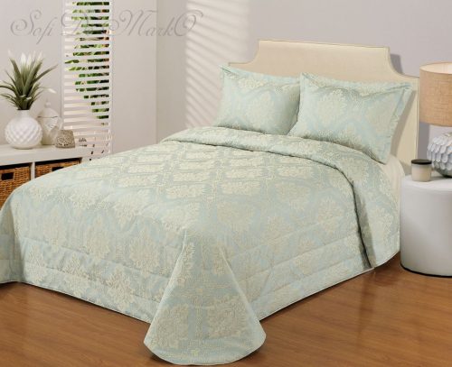 Стеганое, жаккардовое покрывало на подкладке из плотной декоративной ткани. Отличительной особенностью данной модели является её оригинальный жаккардовый рисунок. Данное стеганое покрывало представляет собой многослойное изделие, внешняя часть изделия состоит из жаккардового полотна, а внутренний наполнитель состоит из силиконизированного волокна плотность которого составляет 100г/м2. Для того, чтобы внутренний слой не сбивался в комки и создать фактурность внешних слоев, по всей площади покрывала производится простежка (прошивание). Это могут быть ровные линии или фантазийные узоры.