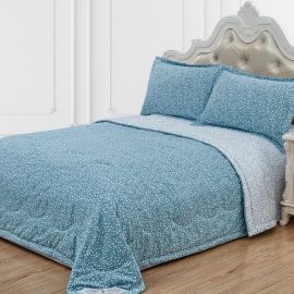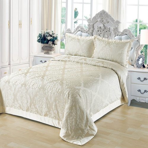 Стеганое, жаккардовое покрывало на подкладке из плотной декоративной ткани. Отличительной особенностью данной модели является её оригинальный жаккардовый рисунок. Данное стеганое покрывало представляет собой многослойное изделие, внешняя часть изделия состоит из жаккардового полотна, а внутренний наполнитель состоит из силиконизированного волокна плотность которго составляет 100г/м2. Для того, чтобы внутренний слой не сбивался в комки и создать фактурность внешних слоев, по всей площади покрывала производится простежка (прошивание). Это могут быть ровные линии или фантазийные узоры.