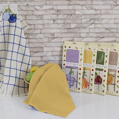 Вафельные полотенца от бренда Sofi de Marko изготавливают из 100% хлопка с рельефным плетением. При изготовлении используется особое переплетение нитей которое образует на полотне клеточки что способствует лучшему поглощению влаги. Основным достоинством полотенец можно считать их впитывающую способность, они отлично впитывают и быстро сохнут. А также преимуществом вафельных полотенец перед другим материалом очевидны, из-за своей структуры данные полотенца впитывают в несколько раз выше чем любые другие такого же веса и объёма. Полотенца способны выдержать большое количество стирок они достаточно прочные. При использовании не оставляют за собой частички ворса и имеют широкий спектр применения.