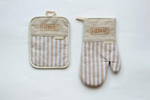 Набор для кухни от бренда Sofi de Marko состоит из трех предметов: фартук, прихватка и варежка.