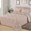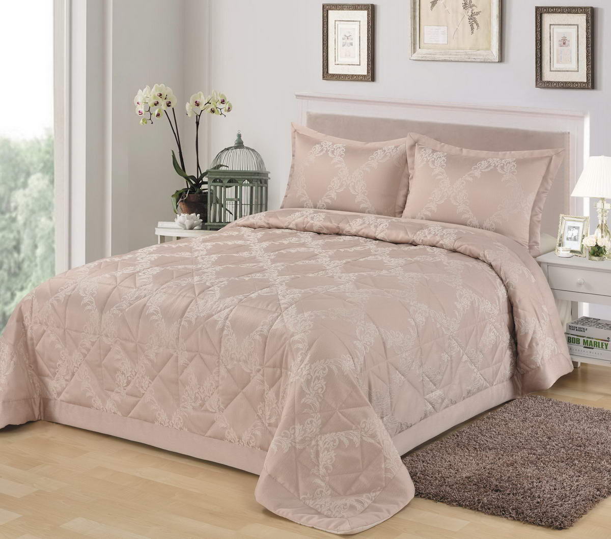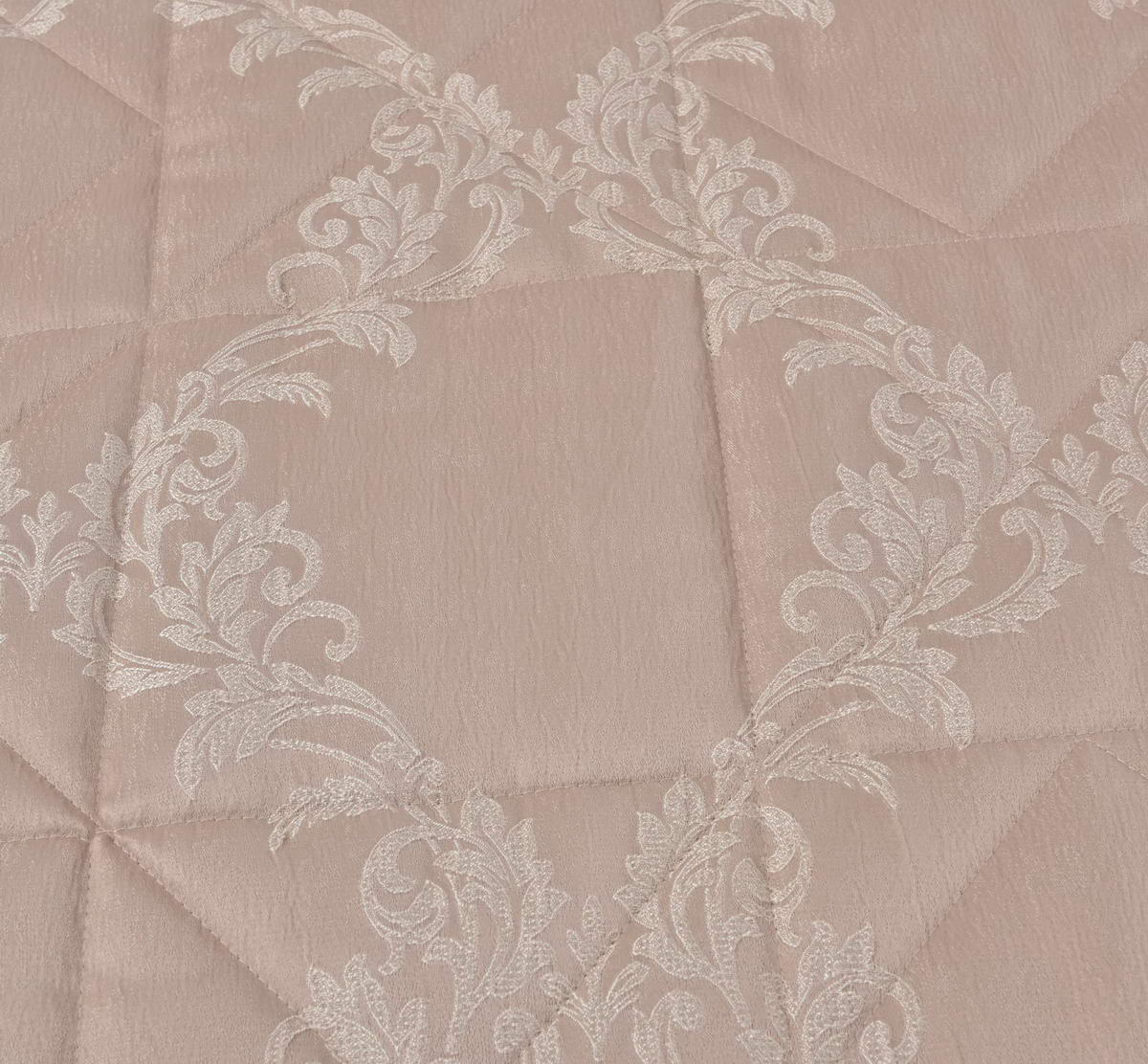 Стеганое, жаккардовое покрывало на подкладке из плотной декоративной ткани. Отличительной особенностью данной модели является её оригинальный жаккардовый рисунок. Данное стеганое покрывало представляет собой многослойное изделие, внешняя часть изделия состоит из жаккардового полотна, а внутренний наполнитель состоит из силиконизированного волокна плотность которго составляет 100г/м2. Для того, чтобы внутренний слой не сбивался в комки и создать фактурность внешних слоев, по всей площади покрывала производится простежка (прошивание). Это могут быть ровные линии или фантазийные узоры.