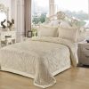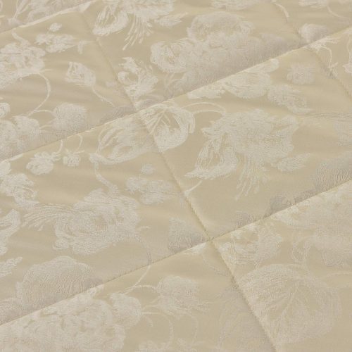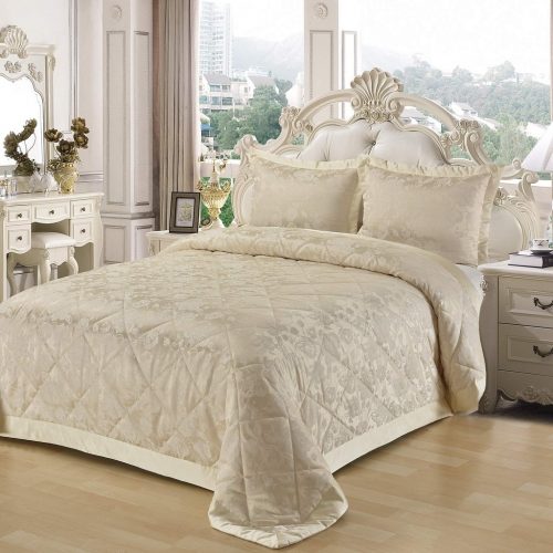 Стеганое, жаккардовое покрывало на подкладке из плотной декоративной ткани. Отличительной особенностью данной модели является её оригинальный жаккардовый рисунок. Данное стеганое покрывало представляет собой многослойное изделие, внешняя часть изделия состоит из жаккардового полотна, а внутренний наполнитель состоит из силиконизированного волокна плотность которго составляет 100г/м2. Для того, чтобы внутренний слой не сбивался в комки и создать фактурность внешних слоев, по всей площади покрывала производится простежка (прошивание). Это могут быть ровные линии или фантазийные узоры.