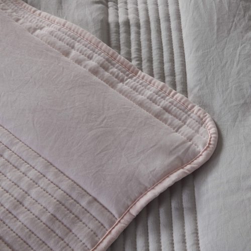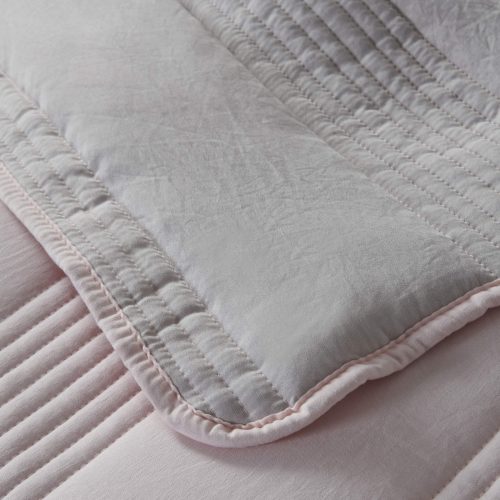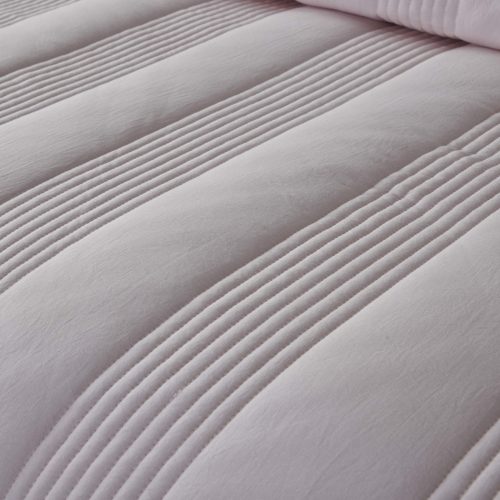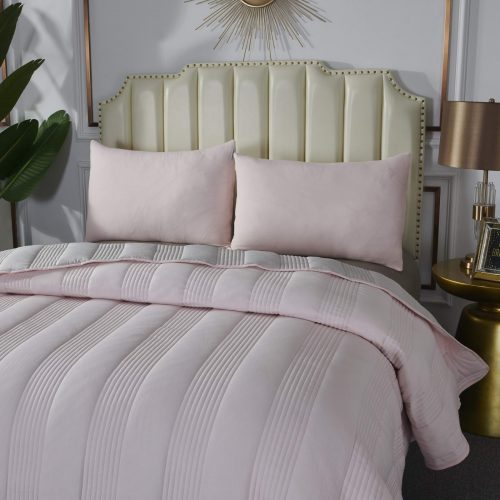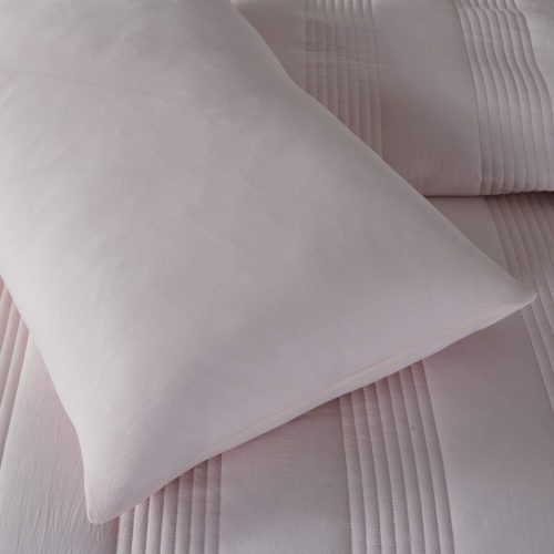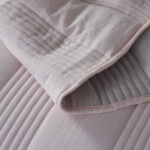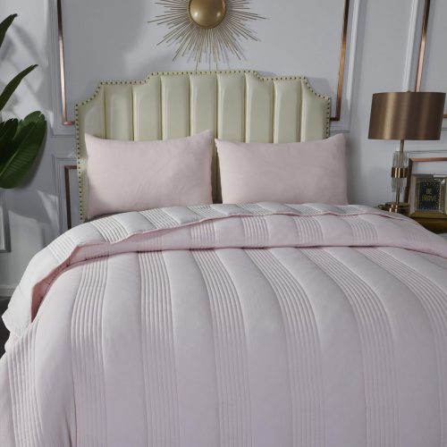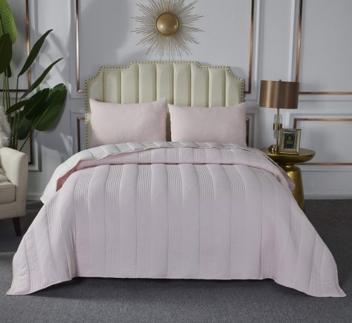 Покрывало выполнено в стиле хайтек, представлено в двух размерах и 5 пастельных цветах. Покрывало пошито с кантом. В комплекте идут одноцветные наволочки, без наполнителя и стежки для простоты в уходе. Дополнительный объем покрывалу придает повышенный граммаж наполнителя, за счет чего лаконичная классическая стежка выглядит более контрастно.