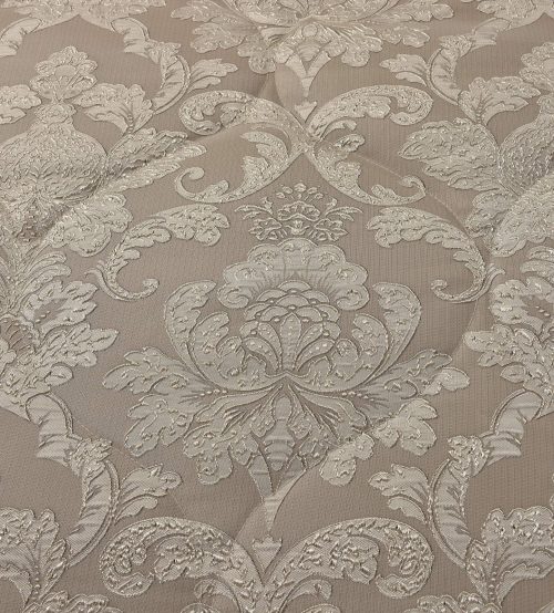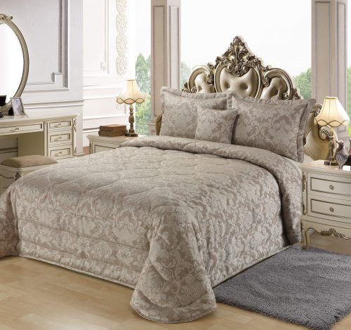 Стеганое, жаккардовое покрывало на подкладке из плотной декоративной ткани. Отличительной особенностью данной модели является её оригинальный жаккардовый рисунок. Данное стеганое покрывало представляет собой многослойное изделие, внешняя часть изделия состоит из жаккардового полотна, а внутренний наполнитель состоит из силиконизированного волокна плотность которго составляет 100г/м2. Для того, чтобы внутренний слой не сбивался в комки и создать фактурность внешних слоев, по всей площади покрывала производится простежка (прошивание). Это могут быть ровные линии или фантазийные узоры.
