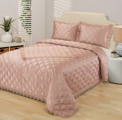 Стеганое, жаккардовое покрывало на подкладке из плотной декоративной ткани. Отличительной особенностью данной модели является её оригинальный жаккардовый рисунок. Данное стеганое покрывало представляет собой многослойное изделие, внешняя часть изделия состоит из жаккардового полотна, а внутренний наполнитель состоит из силиконизированного волокна плотность которго составляет 100г/м2. Для того, чтобы внутренний слой не сбивался в комки и создать фактурность внешних слоев, по всей площади покрывала производится простежка (прошивание). Это могут быть ровные линии или фантазийные узоры.