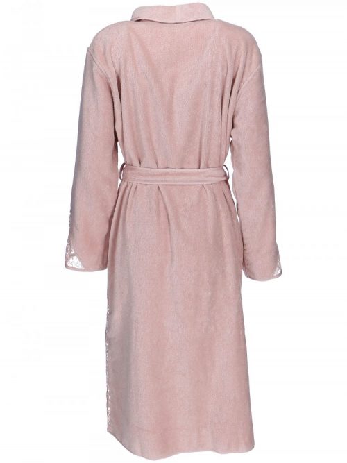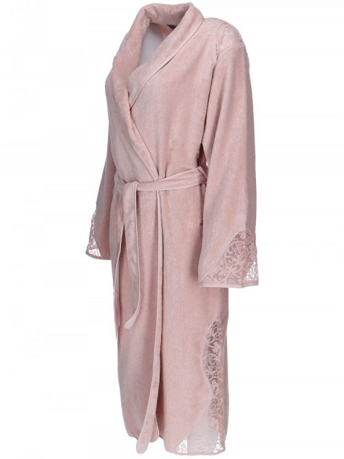 Изысканное кружево в сочетание с нежной махрой – пожалуй, главная отличительная черта женского халата Hazal. Халат имеет классическую длину, на поясе. Декоративная отделка кружевом по плечам, по бокам халата и манжетам рукавов.