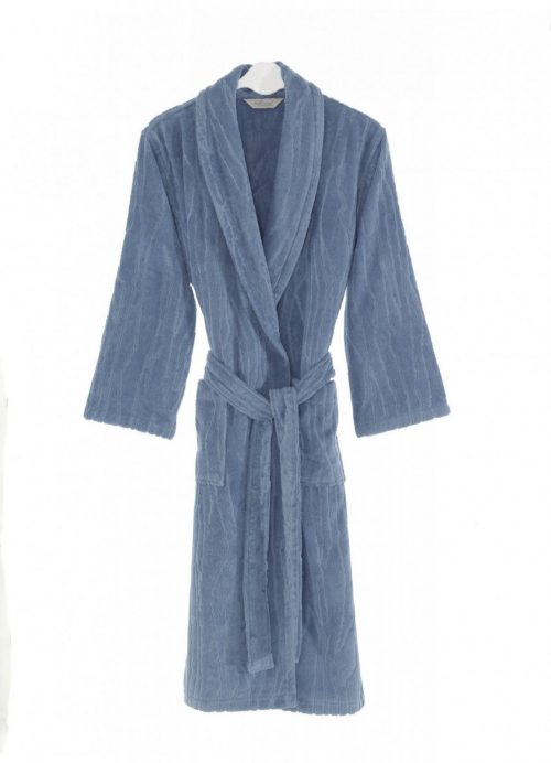 Халат классического покроя, на съемном поясе, накладные карманы по бокам. Фактурная выработка махры в виде зигзагообразных волн придает халату изысканный и оригинальный вид, ориентировочная длина 125 см. Представлен в пяти цветах: белый, кремовый, голубой, серый и темно-синий. К этой серии дополнительно можно подобрать полотенца, что позволит создать уточенный и неповторимый стиль Вашей ванной комнаты. Изделие бережно сложено в индивидуальную ПВХ упаковку с логотипом бренда.