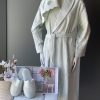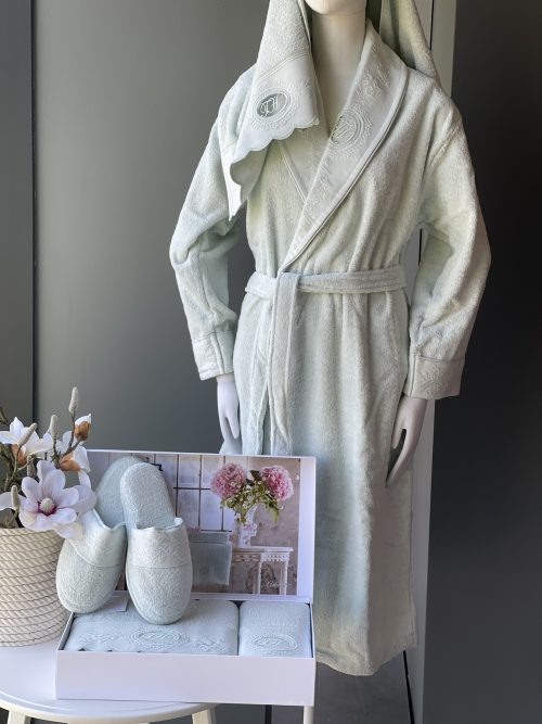 В подарочный набор входит: халат классической длины с воротником, лицевое и банное полотенца, тапочки. В производстве махровых изделий компания Tivolyo Home использует только лучшие, экологически чистые сорта хлопка.