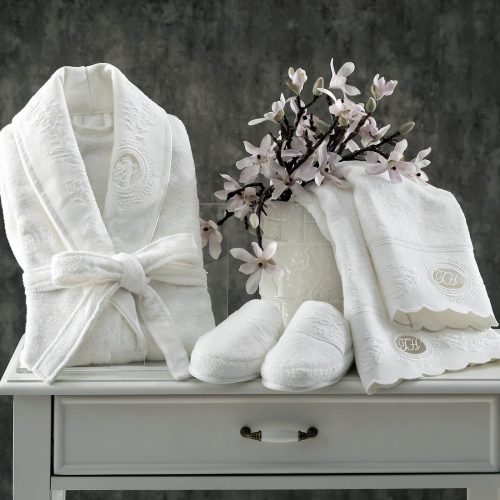 В подарочный набор входит: халат классической длины с воротником, лицевое и банное полотенца, тапочки. В производстве махровых изделий компания Tivolyo Home использует только лучшие, экологически чистые сорта хлопка.
