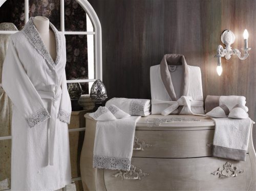 Женские халаты, полотенца и тапочки украшены контрастной хлопковой вставкой и белым кружевом, мужские — контрастной хлопковой вставкой.