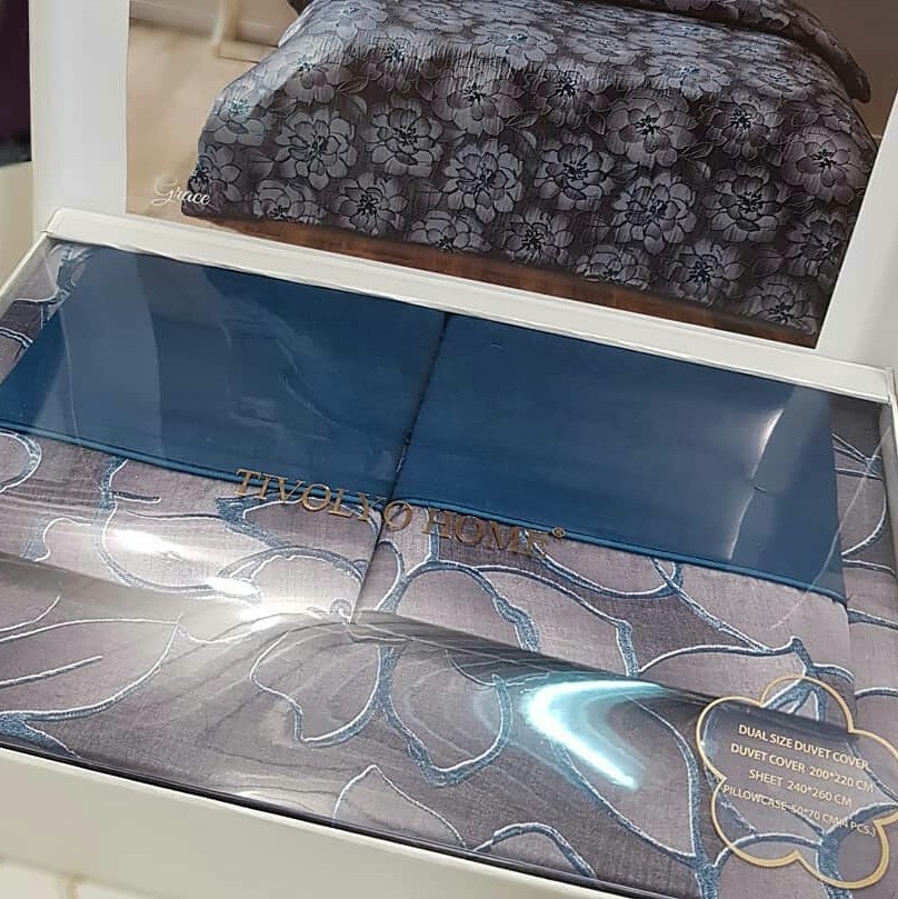Tivolyo Home является премиальным турецким брендом широко известным на европейском рынке. Вся продукция выполнена под тщательным контролем специалистов, только из высококачественных материалов при учете всех современных тенденций в мире моды. В коллекции сатин-жатый шелк в основном используется цветочный орнамент в сочетании с однотонной простыней идеально подобранной в цвет. Внутрення сторона пододеяльника, простыня и две наволочки из сатина, а лицевая сторона пододеяльника и две другие наволочки — из жатого шелка. Изделия бережно сложены в подарочную упаковку с логотипом фирмы.