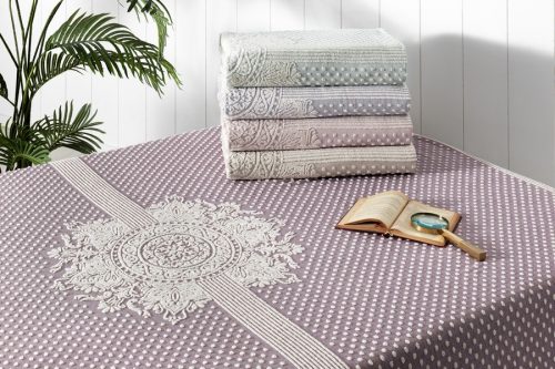 Легкое покрывало пике из серии HERMES представлено в пяти классических цветах: бежевый, розовый, бирюзовый, фиолетовый и сиреневый. По краям покрывало декорировано бахромой. Идеально подойдет для летнего времени года, покрывало можно использовать в качестве простыни для укрывания.
