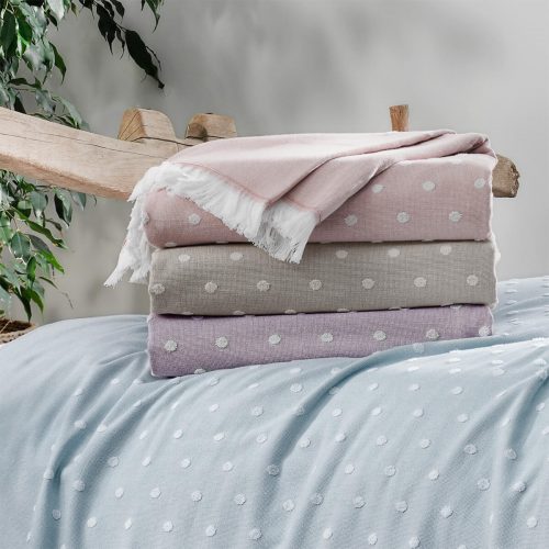 Легкое покрывало пике из серии Olinda представлено в четырех классических цветах: бежевый, розовый, бирюзовый, фиолетовый. По краям покрывало декорировано бахромой. Идеально подойдет для летнего времени года, покрывало можно использовать в качестве простыни для укрывания.