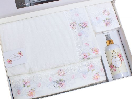 Набор от турецкого бренда премиум класса Tivolyo Home состоит из трех предметов: салфетка-полотенце, лицевое и банное полотенце плюс ароматический спрей как подарок от производителя. Изделия бережно вложено в роскошную подарочную упаковку, которая подчеркивает уникальную отделку полотенец либо вышивкой, либо итальянским кружевом. Оригинальный и неповторимый подарок для любимых сердцу людей.